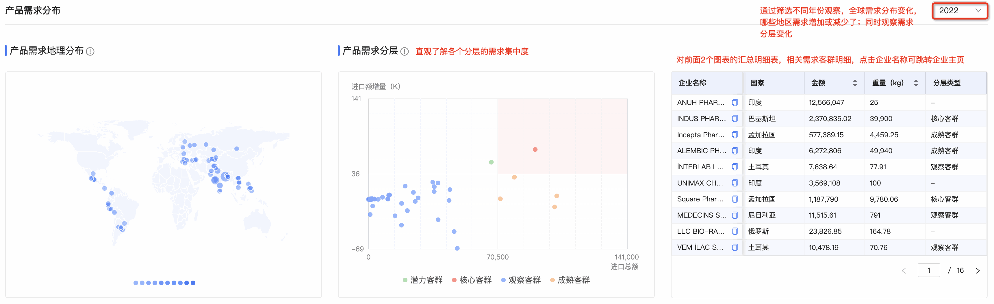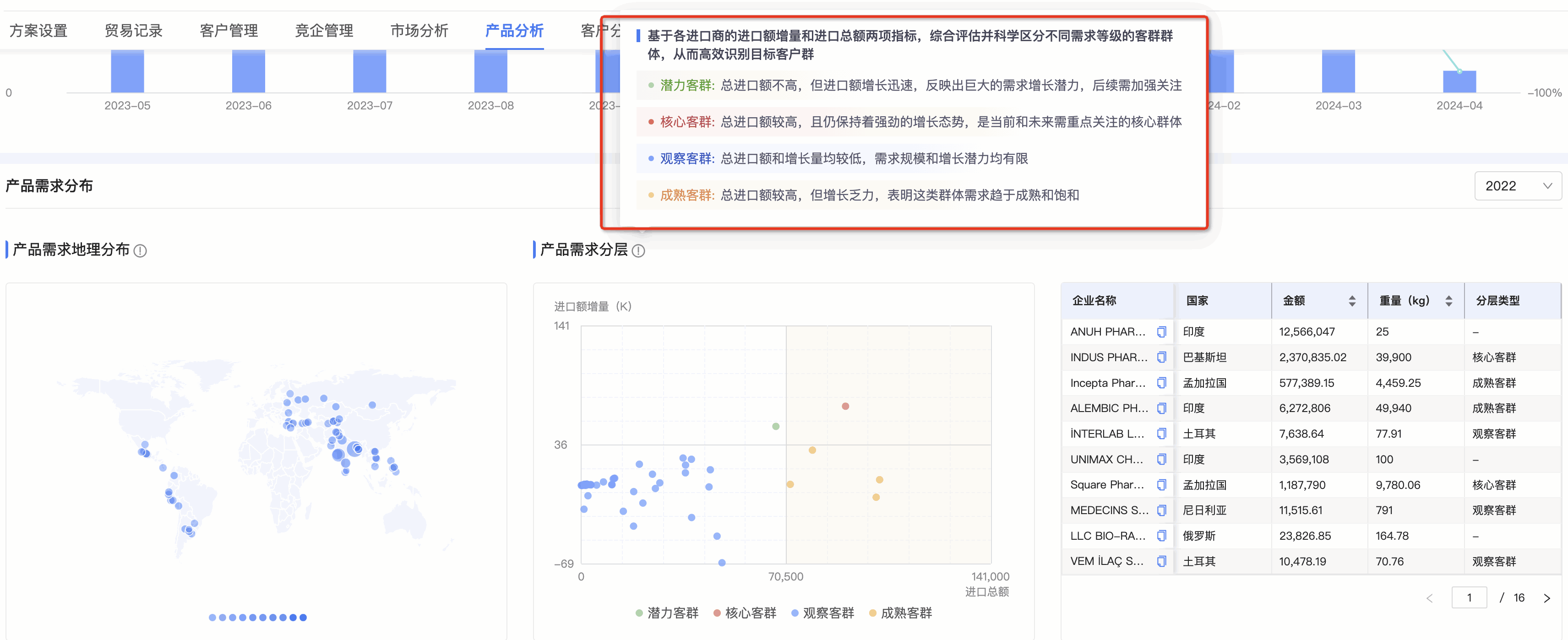 ● 产品需求分层图:kdpay钱包官网数据通将需求客群按照进口额增量和总额进行分层,划分为潜力、观察、成熟和核心四个层级。分层有助于用户快速锁定目标客户群体。标题旁附需求分层的解读,能让用户更直观、快速理解每个层级的特征,能够更快速的识别目标客群。
